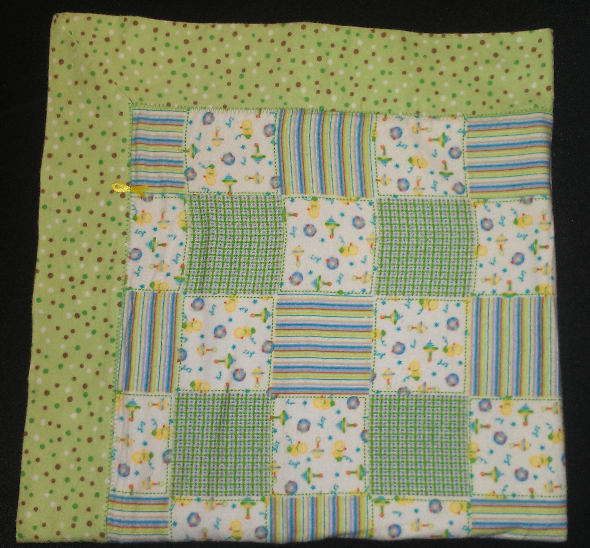 Receiving blankets are made with two layers of 100% cotton flannel, so your baby can be comfortably wrapped in cozy comfort. They are large enough to completely swaddle your baby and are between 34-38 inches square. Blankets are reversible, with the back framing the center of the front, or the back all one design.