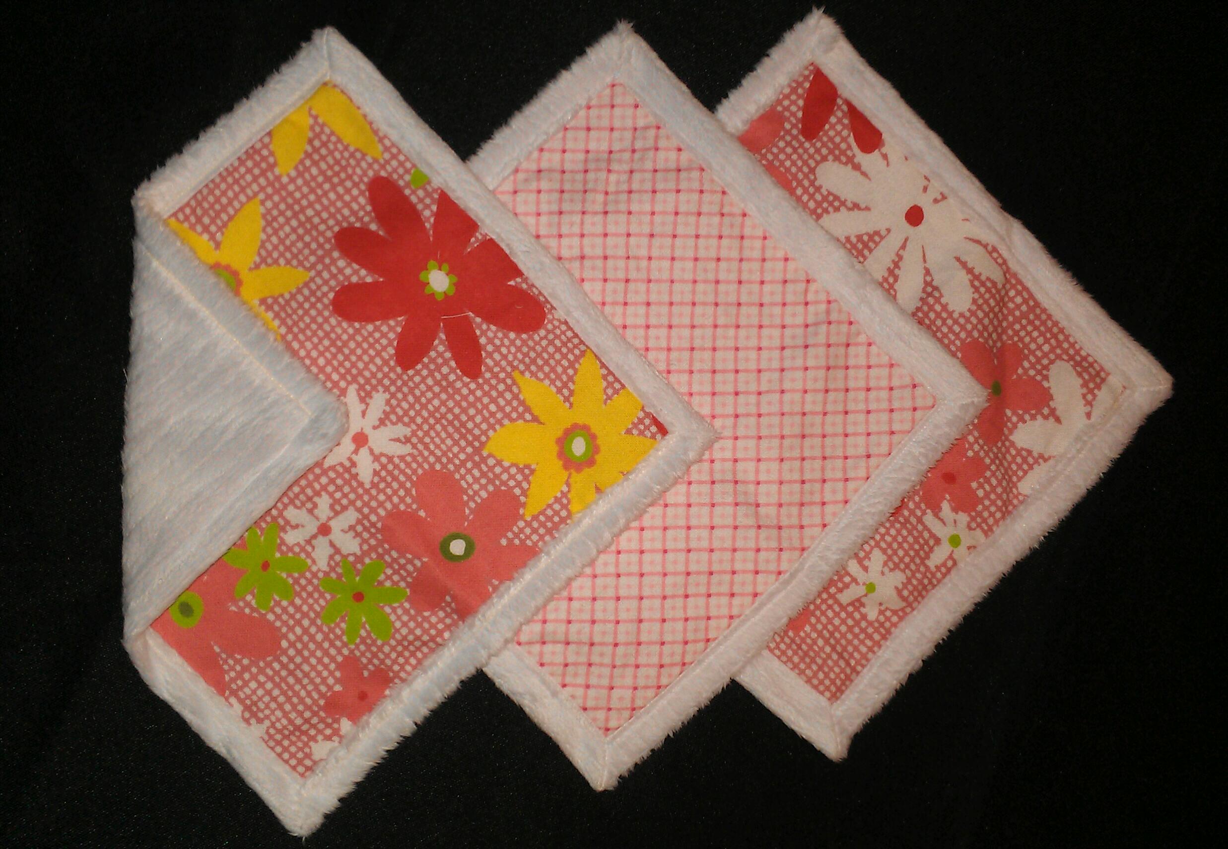 Baby wash cloth set includes three coordinating wash cloths. Each cloth is 7.5” square and features flannel on one side and the other side is an ultra soft and ultra sudsy Minky-esk material in white textured stripes. Fabulous for washing all of baby's delicate parts!